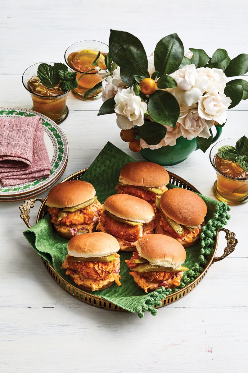 I grew up watching the Masters with my grandparents, and the picturesque scenes of pink and white flowers, the sounds of golf claps and hushed announcers, and the taste of my nana’s pimiento cheese fill my head every April. My pimiento cheese recipe differs from both the famous Augusta National recipe and the one Nana made, because I gussy it up with Gouda cheese, Worcestershire sauce, sweet onion and paprika. I like to serve it on slider buns with fried chicken tenders and pickled okra, topped with toothpicks fashioned after the iconic Augusta yellow tee flag. They’re so good that your guests will want to stay long after the Green Jacket ceremony ends.