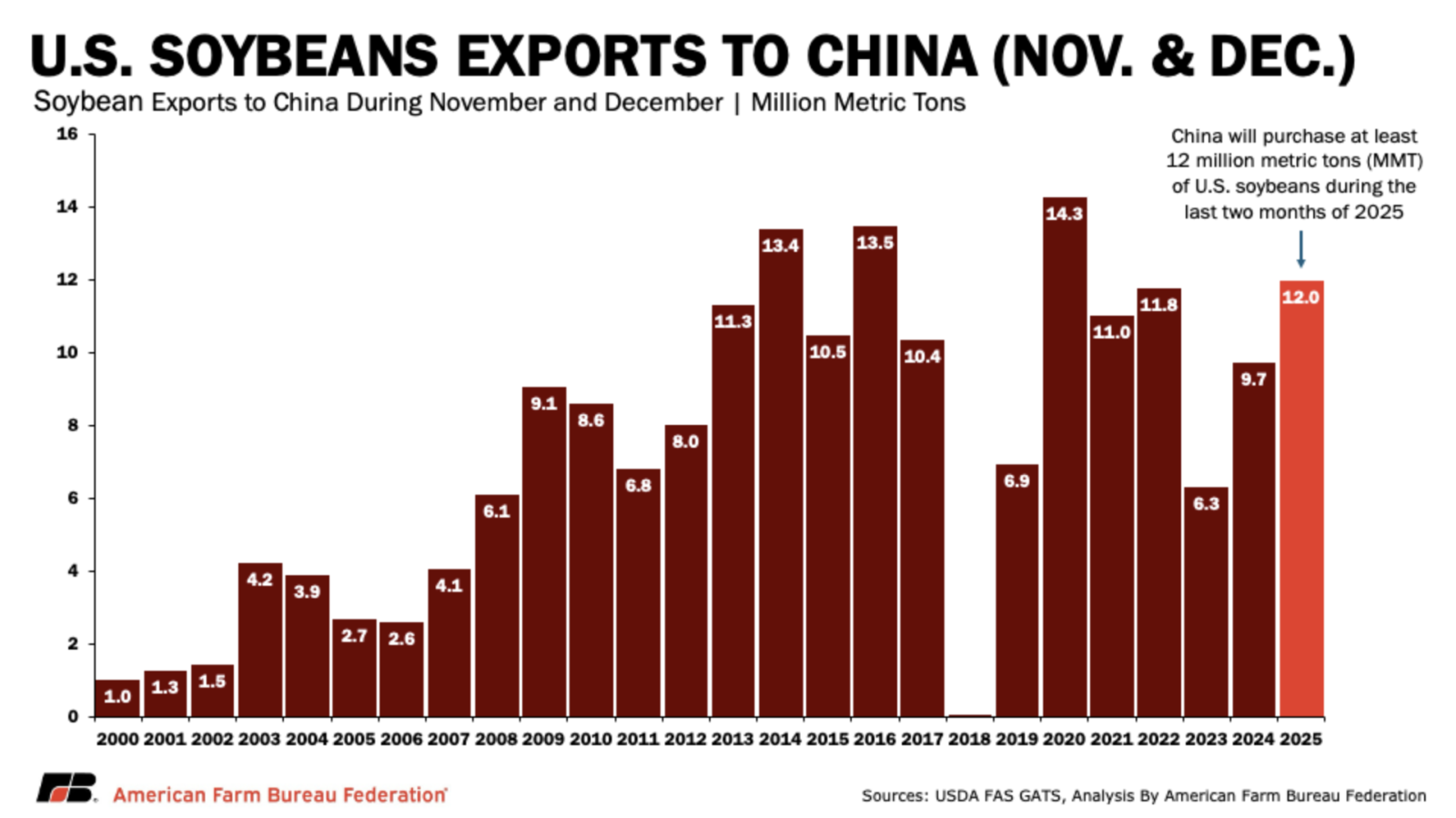 AFBF analysis indicates that the 12 MMT commitment for the rest of 2025 is a lofty but achievable goal. Over the last decade, U.S. soybean exports to China during the last 2 months of the calendar year averaged 9.5 MMT. If realized, China’s purchases of 12 MMT of soybeans in November and December of this year would be the fourth-highest export volume in history. When combined with nearly 6 MMT of soybeans already exported in calendar year 2025, total soybean purchases would approach 18 MMT, before increasing to 25 MM over the next 3 calendar years.