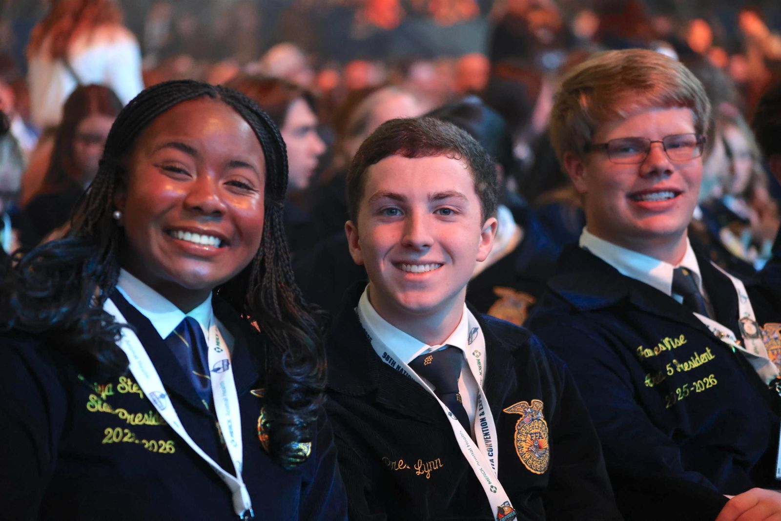 From left, Georgia FFA Association State President Remiyah Stephens (Rutland), delegate Preston Lynn (Bainbridge) and delegate James Wise (Tift County) attend a general session of the 98th National FFA Convention. /Photo courtesy of Georgia FFA