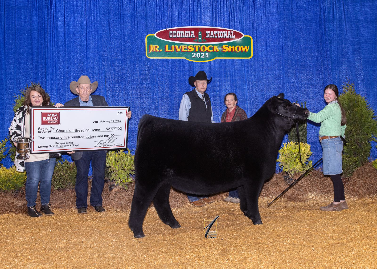 Banks County High School FFA member Raegan Gilbert exhibited the Grand Champion Breeding Heifer at the 2025 Georgia Jr. National Livestock Show held in Perry in February. At left, Georgia Farm Bureau President Tom McCall & his wife, Jane, present the $2,500 prize check to Gilbert as show judges Travis & Beth Pembrook offer congratulations. / Photo courtesy of Square One Agri Marketing