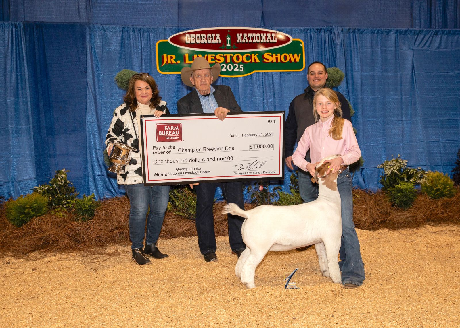 North Forsyth County High School FFA member Cash Adams showed the Grand Champion Breeding Doe at the 2025 Georgia Jr. National Livestock Show held in Perry in February. From left, Georgia Farm Bureau Field Services Director Clay Talton presents the $1,000 prize check to Adams as show judge Jake Warntjes presents the trophy. / Photo courtesy of Square One Agri Marketing
