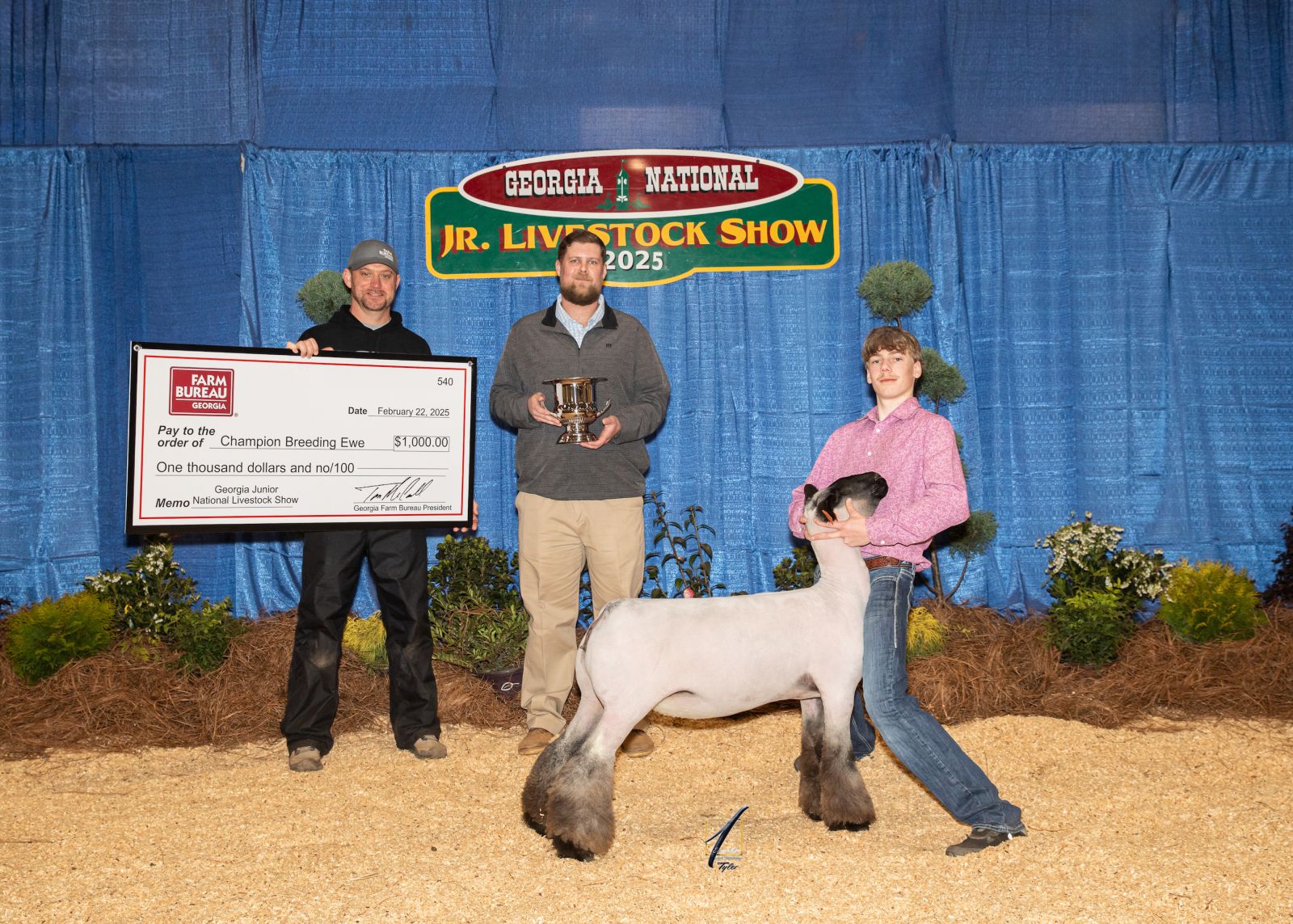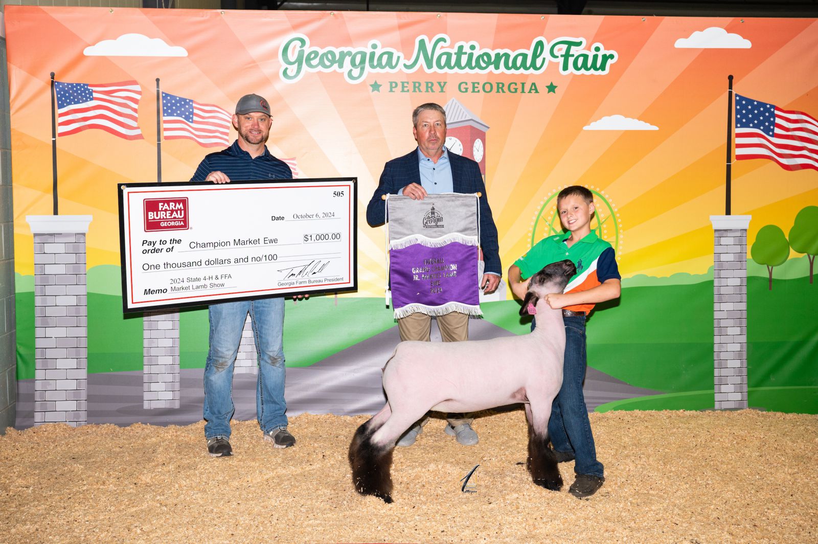 White County 4-Her Luke Keener showed the 2024 Georgia Jr. National Grand Champion Market Ewe during the 2024 Georgia National Fair held in Perry last October. Kenner is congratulated by show judge Jason Simpson as Georgia Farm Bureau Field Services Director Clay Talton presents the $1,000 prize check to Keener. / Photo courtesy of Square One Agri Marketing