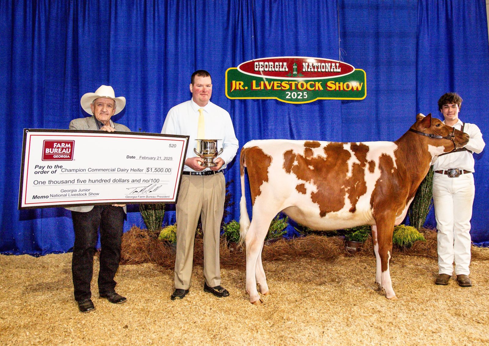 Coweta County 4-H member Caeden Swartz exhibited the Grand Champion Commercial Dairy Heifer at the 2025 Georgia Jr. National Livestock Show held in Perry in February. From left, Georgia Farm Bureau President Tom McCall, presents the $1,500 prize check to Swartz as show judge Shawn Nehls offers congratulations. / Photo courtesy of Square One Agri Marketing