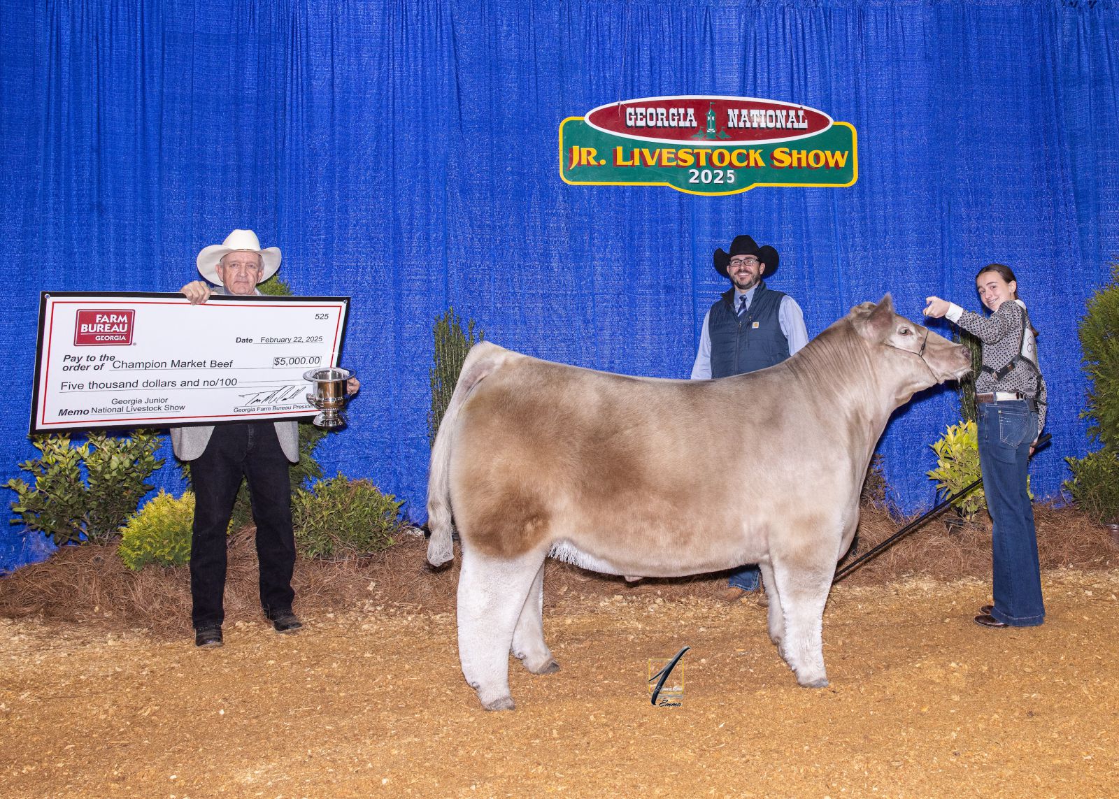 Colquitt County FFA member Libba Dykes showed the Grand Champion Market Beef Animal at the 2025 Georgia Jr. National Livestock Show held in Perry in February. Georgia Farm Bureau President Tom McCall, left, presents the $5,000 prize check as show judge Ryan Cummins offers congratulations. / Photo courtesy of Square One Agri Marketing