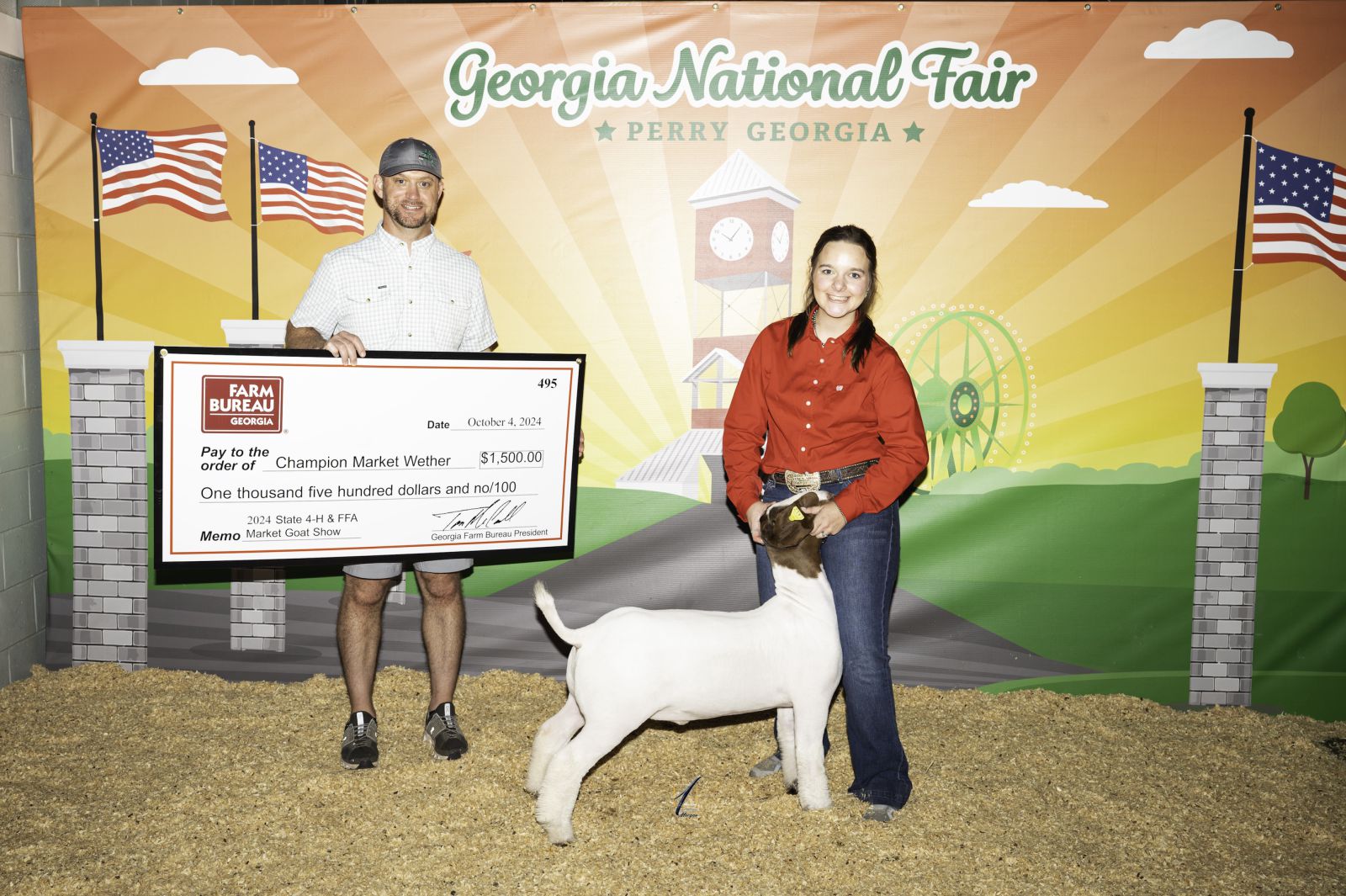 Banks County FFA member Reagen Ferguson won the 2024 Georgia Jr. Market Doe Goat Grand Champion scholarship prize of $1,500 Oct. 5, 2024, at the Georgia National Fair. Reagen is the daughter of Sloane and Breann Ferguson of Homer.