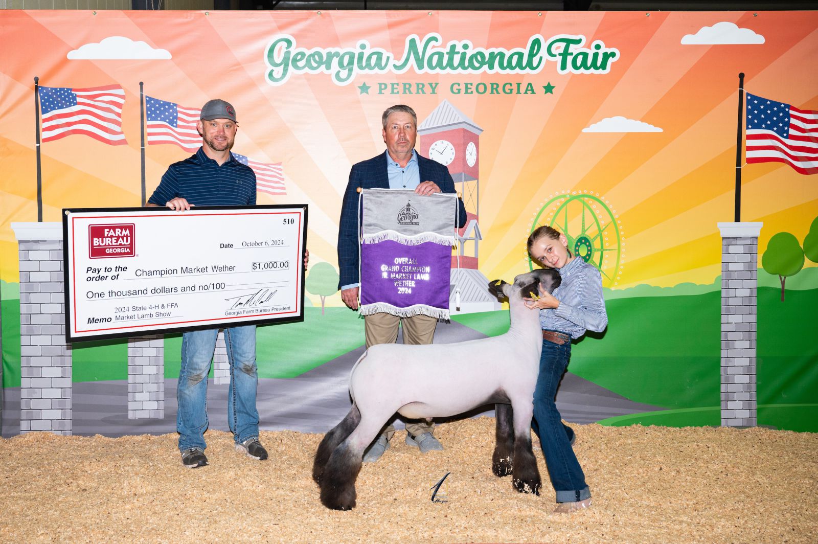 Morgan County 4-Her Savannah Artman showed the 2024 Georgia Jr. National Grand Champion Market Wether Lamb at the 2024 Georgia National Fair held in Perry last October. Artman is congratulated by show judge Jason Simpson as Georgia Farm Bureau Field Services Director Clay Talton presents the $1,000 prize check to Artman. / Photo courtesy of Square One Agri Marketing