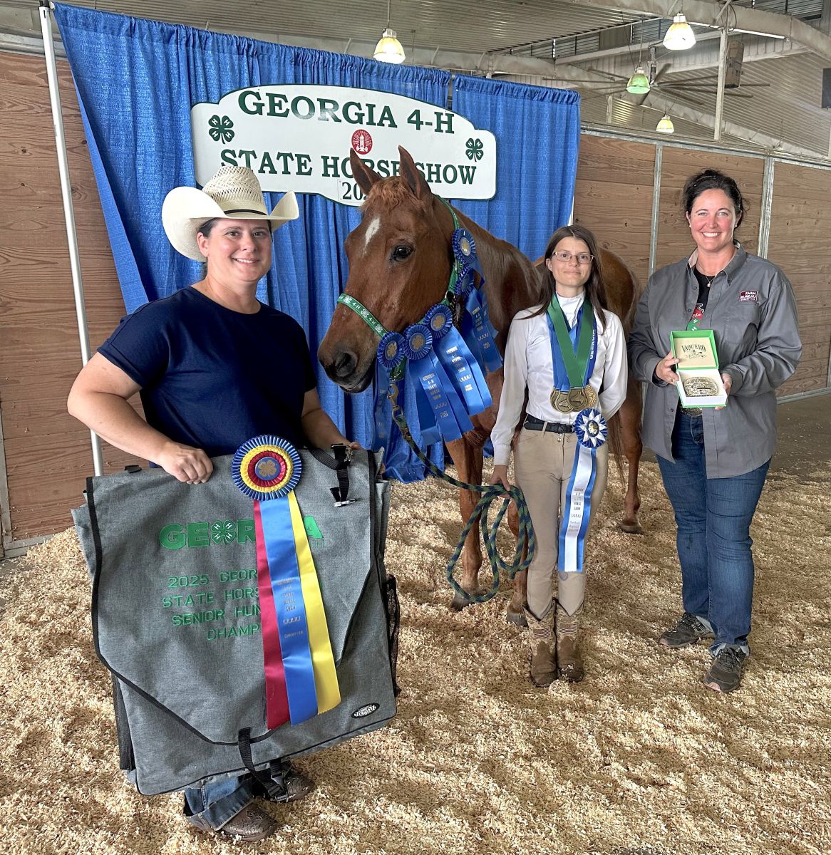 Thomas County 4-Her Emily McBrayer and her horse "Timbukto/Timmy" center, accept the prizes they won for winning the senior Hunt Seat Division at the Georgia 4-H State Horse Show in June from Georgia 4-H Animal science Specialist Kate Whiting, left, and Georgia Farm Bureau Equine Advisory Committee member Lauren Dye, right. Georgia Farm Bureau provided the champion belt buckle Dye presented. / Photo provided by Lauren Dye