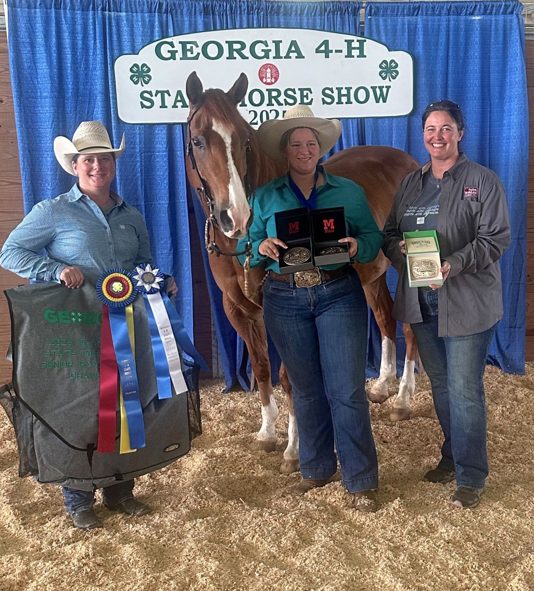 Thomas County 4-Her Jenna McBee & her horse "Tex", center, accept prizes from Georgia 4-H Animal science Specialist Kate Whiting, left, and Georgia Farm Bureau Equine Advisory Committee member Lauren Dye, right, for winning the senior Ranch Horse Division at the Georgia 4-H State Horse Show in June. Georgia Farm Bureau provided the champion belt buckle Dye presented. / Photo provided by Lauren Dye