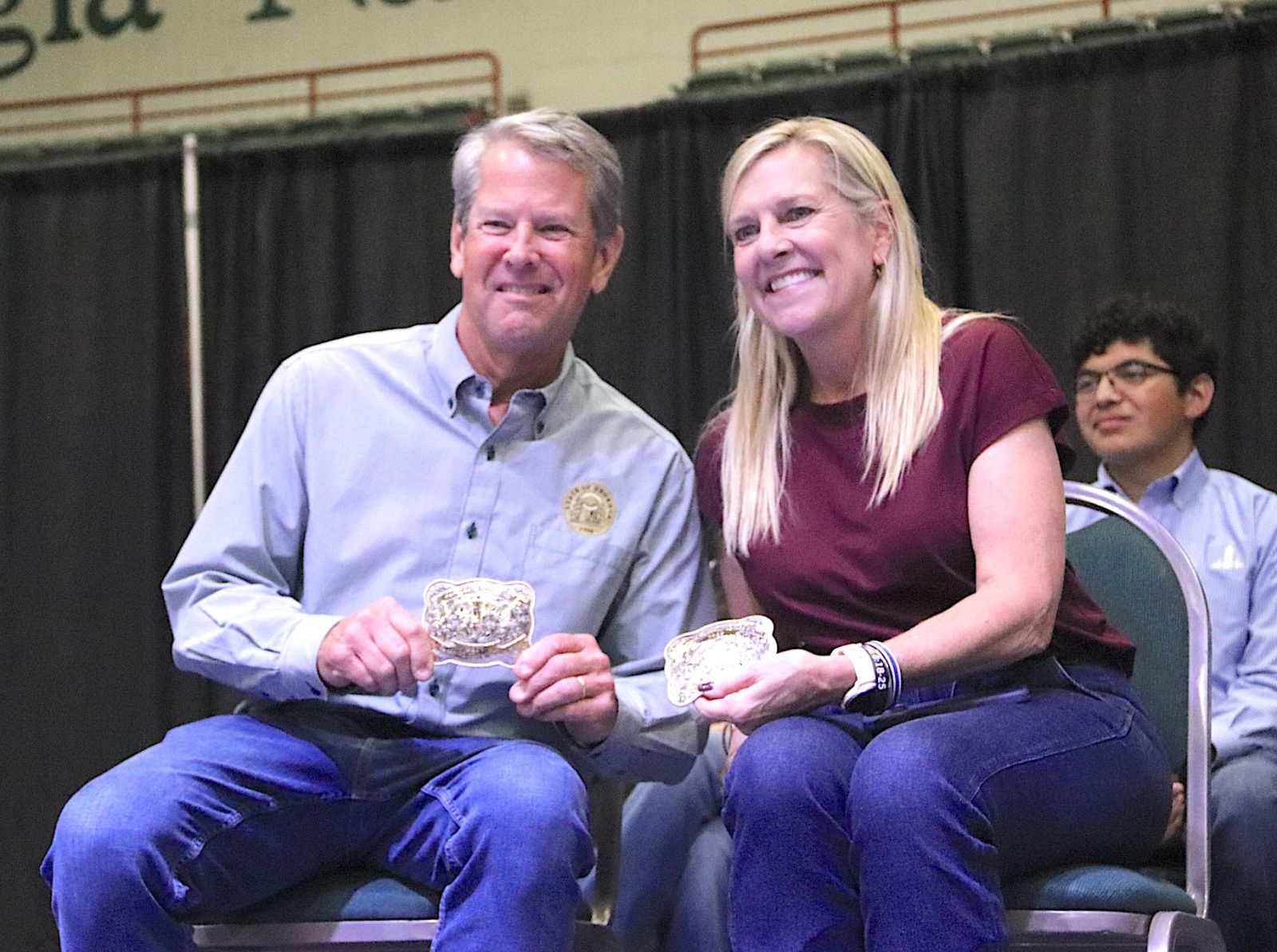 Gov. Brian Kemp & First Lady Marty Kemp proudly display the belt buckles they received from Georgia Agricultural Exposition Authority Chairman Foster Rhodes in recognition of the couple's unwavering support of the Georgia National Fair. / Photo by Jay Stone