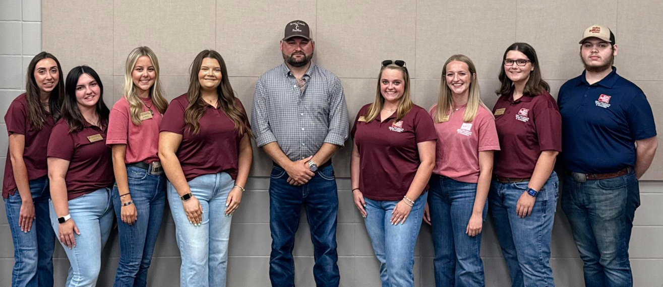 Houston County Farm Bureau Director Cason Anderson, center, with members of the ABAC YF&R Chapter. From left are: Bailey Ellison, Makenzie Beach, Stormie Rackley, Sara Helton, Anderson, Megan Jacobs, Sara Canup, Smith, and ABAC YF&R Chapter President Allison Cook.