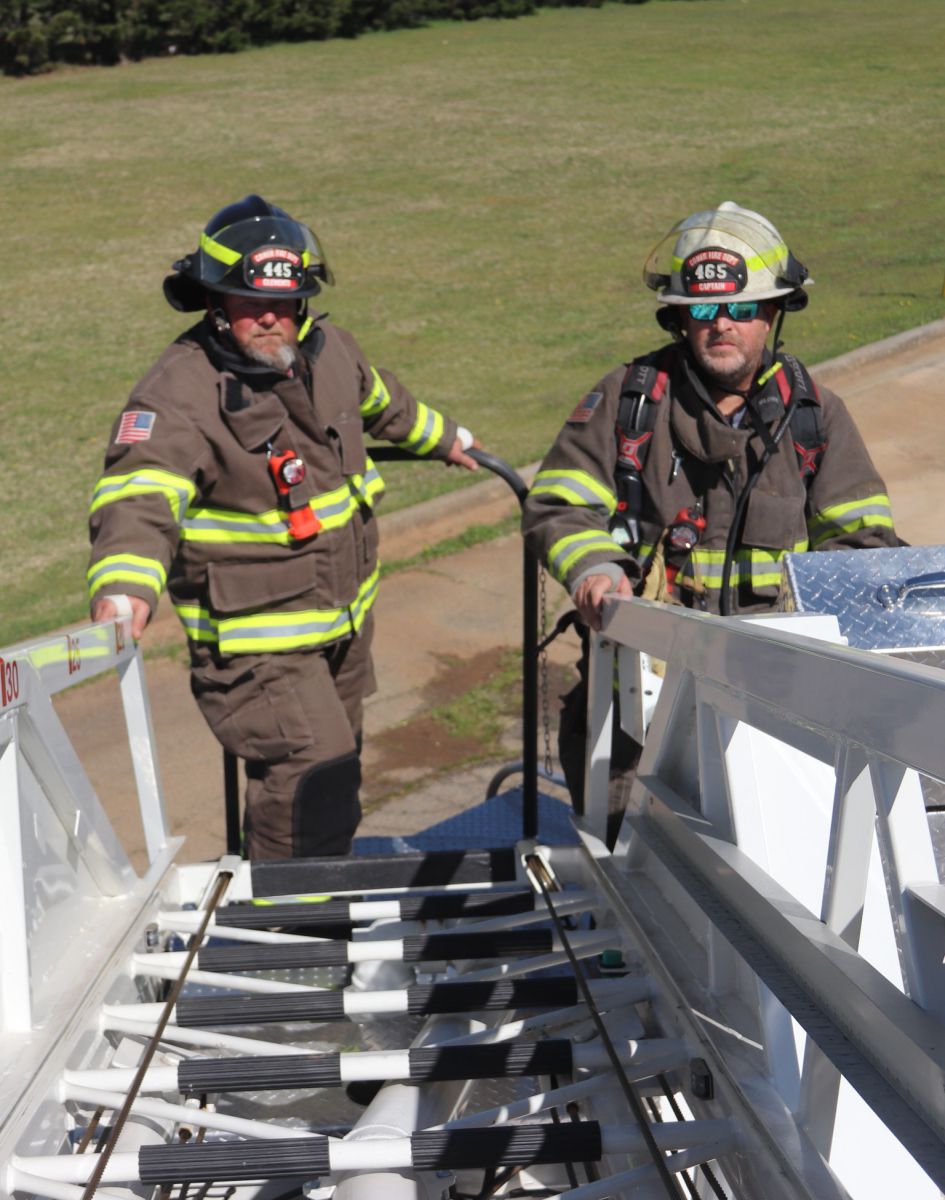 Madison County farmers Jason Fortson and Corey Clements extend the ladder on Comer Fire Department’s ladder truck. / Photo by Jay Stone