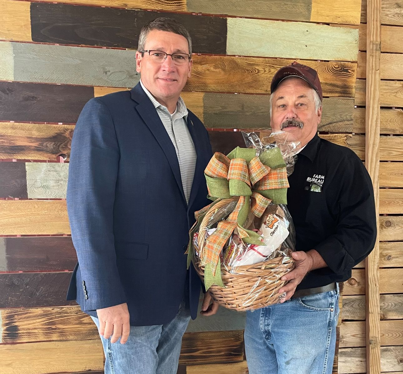 Evans Co. Farm Bureau President Gregg Hendrix, right, presents Ga. Dept. of Ag Field Services Director Dominic LaRiccia with a gift basket for giving the keynote speech at the Evans Co. Blessing of the Planting. / Photo courtesy of Claxton-Evans County Chamber of Commerce.