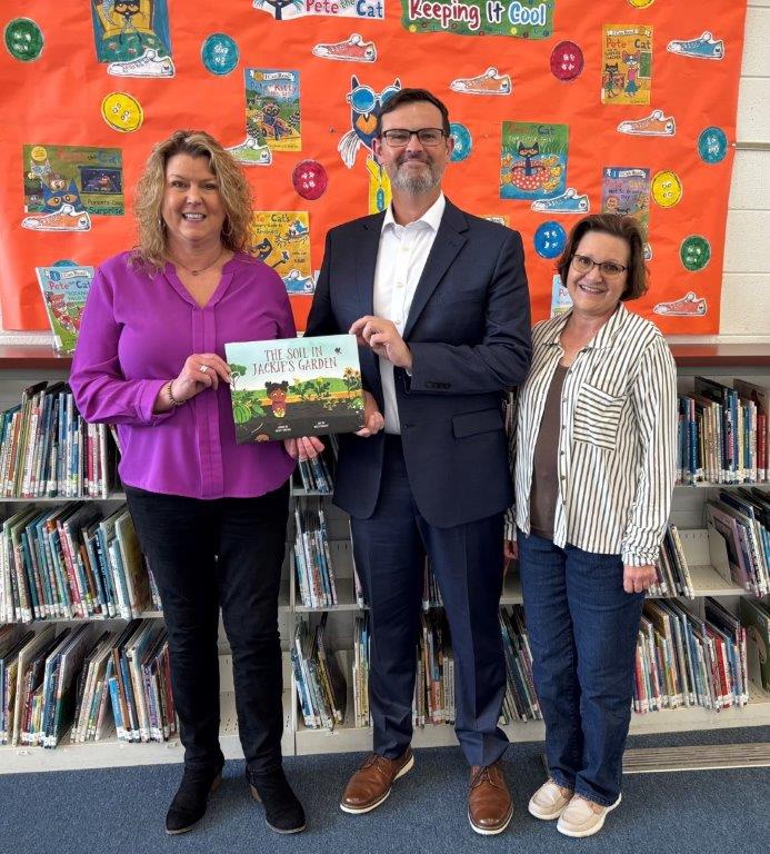From left, on behalf of the Georgia Foundation for Agriculture and Georgia EMC, Dodge County Farm Bureau Office Manager Penny Parkerson and Ocmulgee EMC CEO/General Manager John Turner present a copy of "The Soil in Jackie’s Garden" to Ellen Jones with the Ocmulgee Regional Library System. / Photo courtesy of Dodge County Farm Bureau.