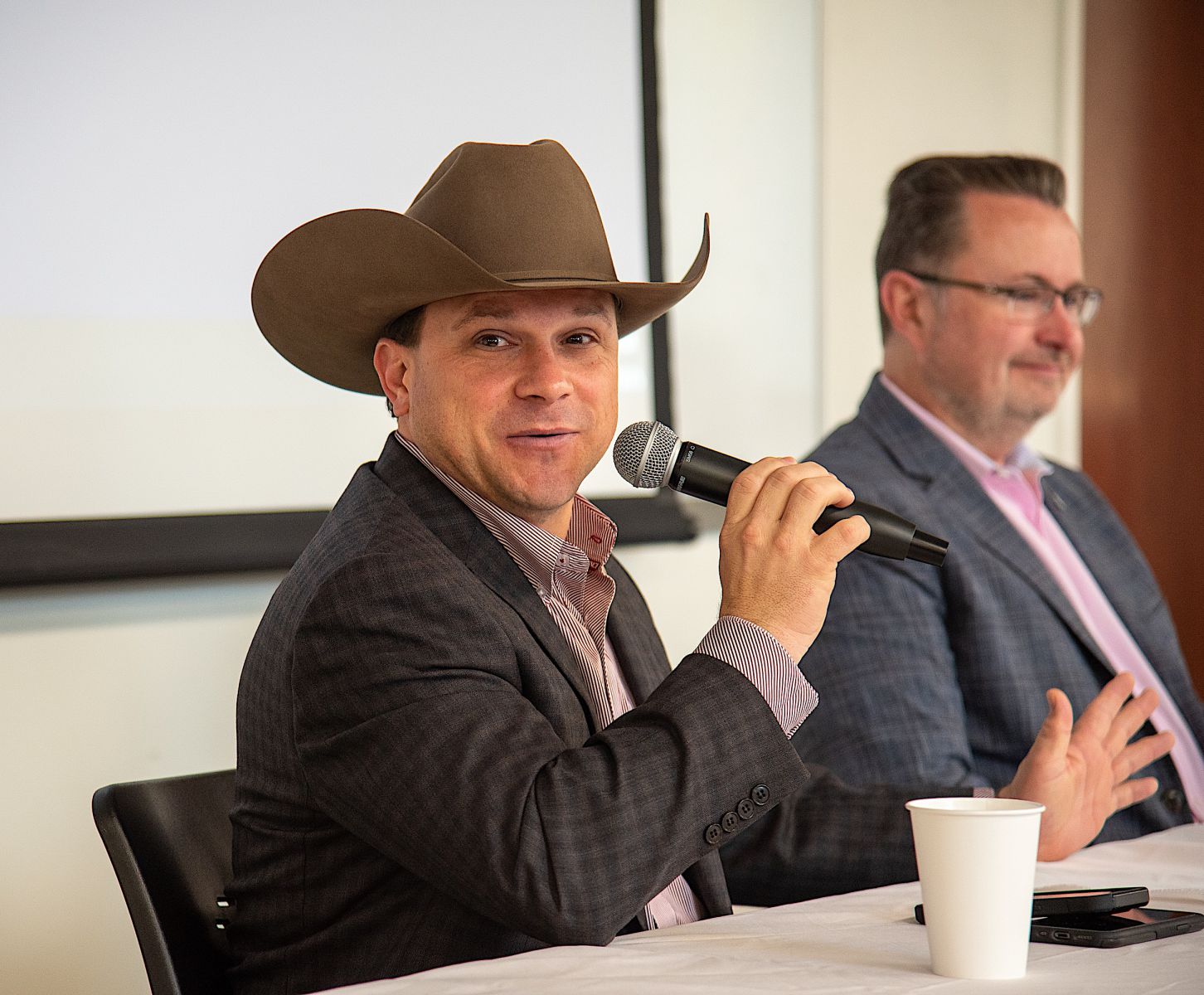 Georgia Commissioner of Agriculture Tyler Harper, left, and Kevin Tanner, commissioner of the Georgia Department of Behavioral Health & Developmental Disabilities (DBHDD), right, discussed farmer mental health during a panel session. /Photo by Logan Thomas