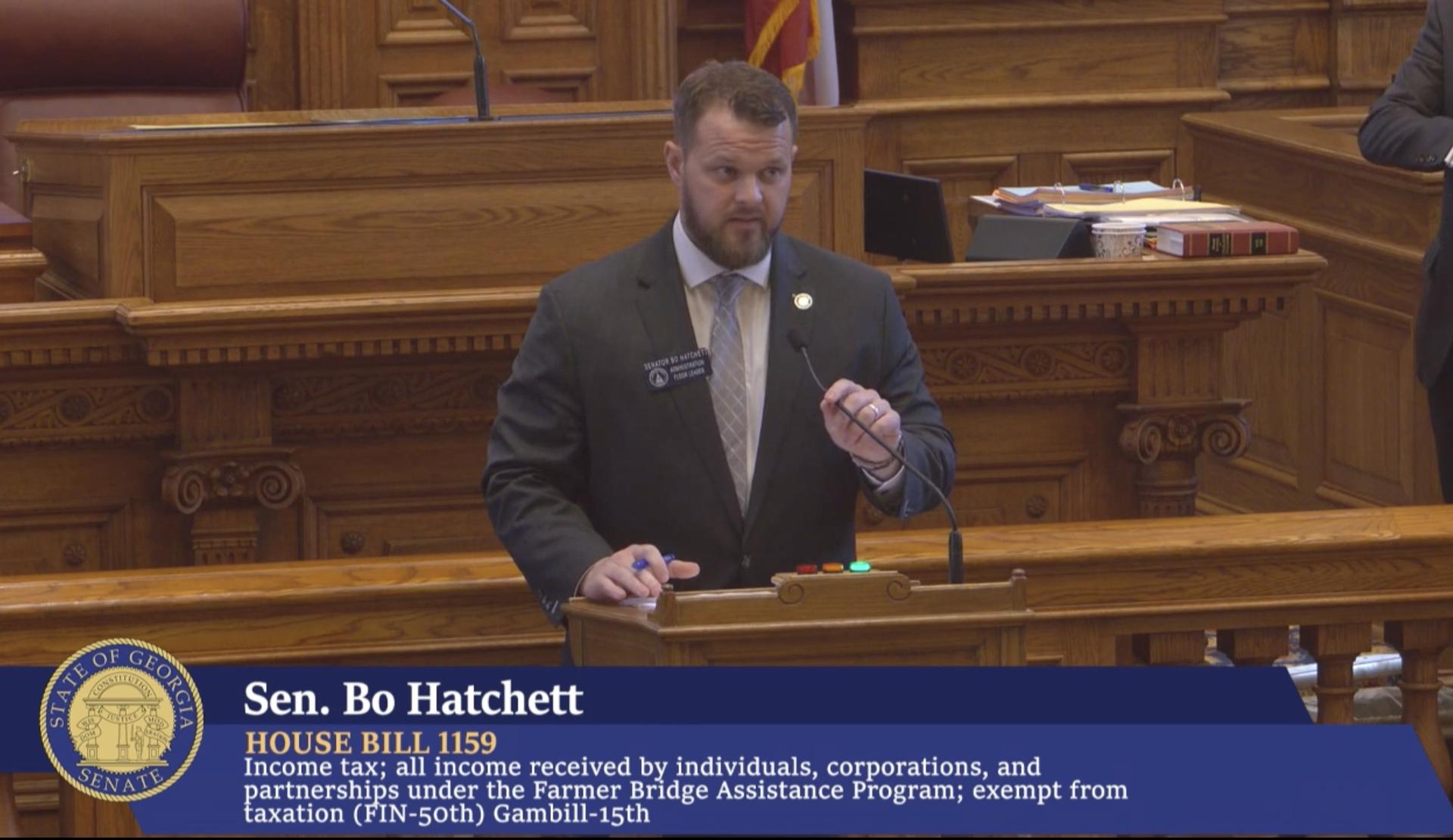 On Wednesday, the full Senate chamber considered HB 1159 by Representative Matthew Gambill (R-Cartersville) and carried by Senator Bo Hatchett (R-Cornelia). This bill will eliminate state income taxes on any Farmer Bridge Payments received from the United States Department of Agriculture.