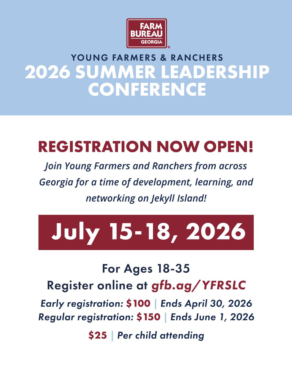 YF&R Summer Leadership Conference is an annual event taking place each summer on Jekyll Island, Georgia. At this event, members attend sessions to be updated on current agricultural issues and prepared to advocate and educate others about agriculture through their county programs. This year's conference will be held July 15th-18th 2026.