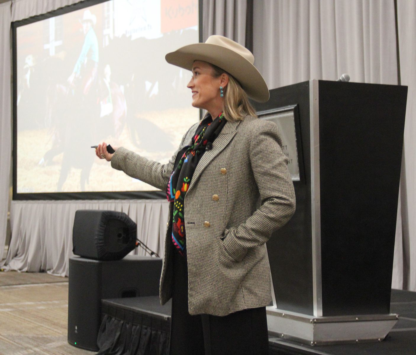 Motivational speaker Courtenay DeHoff, pictured above, shared her cowgirl code for living a legendary, extraordinary life. DeHoff was raised as the fifth generation on her family’s Kansas ranch where she grew up riding horses, tying goats in rodeo competitions and showing Angus cattle. She attended Oklahoma State University, where she received a degree in agricultural communications. After completing an internship at a TV station in Stillwater, Oklahoma, she continued to show up at the tv station to produce stories about agriculture and the station let her keep working for three years.