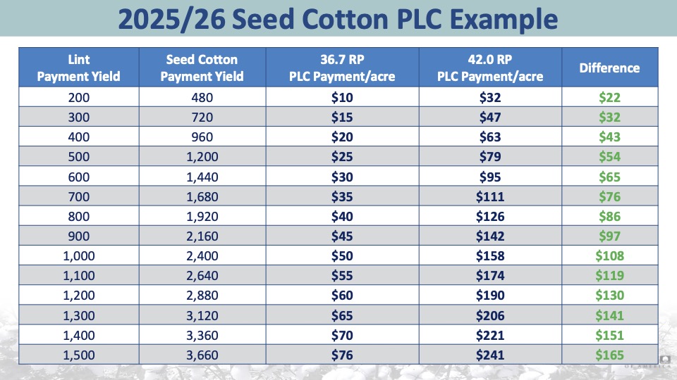 The farm bill provisions in the One Big Beautiful Bill Act increased the reference price for seed cotton to $0.42/lb beginning with the 2025/26 crop. That’s a 14% increase from the previous $0.367/lb for seed cotton. Growers enrolled in either ARC -CO or PLC for the 2025/26 crop will automatically receive the higher of the two payments regardless of their election for this crop year only.