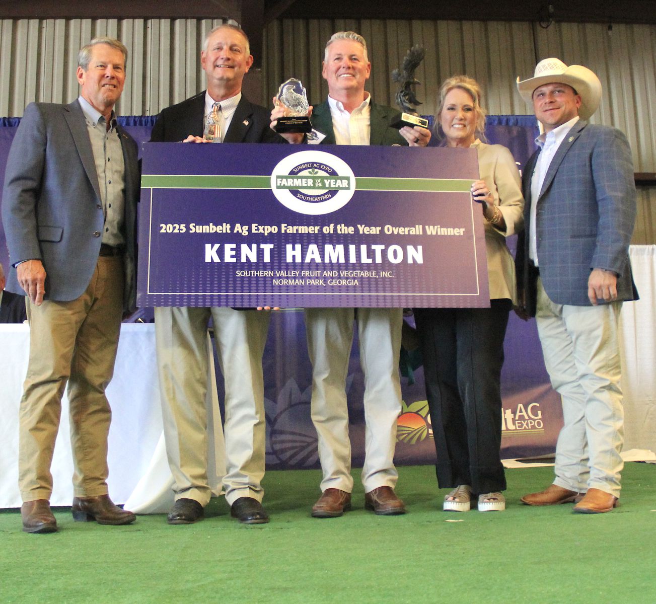 Georgia’s Kent Hamilton, CEO of Southern Valley Fruit & Vegetable, Inc., a family farm based in Norman Park, Ga., accepted the title of 2025 Sunbelt Ag Expo Southeastern farmer of the Year during the annual Willie B. Withers Luncheon on Oct. 14. During a moving, heartfelt speech, Hamilton dedicated the honor to his late brother, Kirk, who died from a farming accident when the two were just beginning to farm 38 years ago. Hamilton also thanked his wife, Pam, his children and extended family members and farm employees.