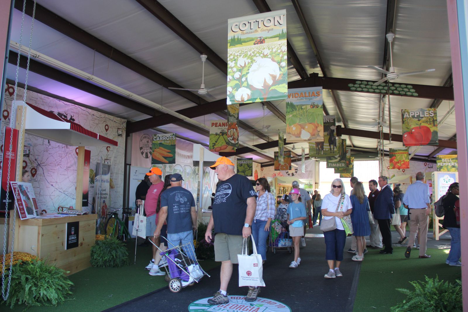 Colorful banners highlighting the many crops Georgia farmers grow including apples, beef, carrots, cotton, dairy, peanuts, pecans, poultry, timber, vegetables, Vidalia onions and watermelons hung from the ceiling throughout the building.